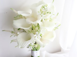 노란 장미 사이로 화이트 카라를 넣어 내추럴한 아름다움을 강조한 부케입니다. 스마일락스 소재도 더해 싱그러움 느낌도 듭니다.