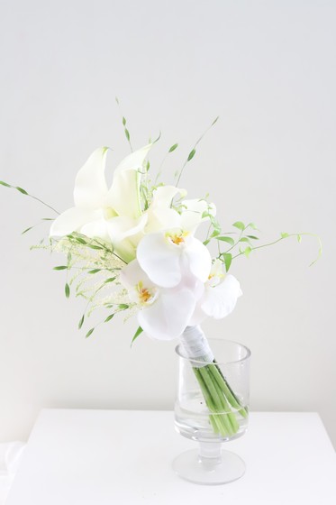 새하얀 호접란과 그린 소재를 활용한 청순한 느낌의 부케입니다. 아스틸베와 유니폴라까지 더하여 청량한 느낌 또한 드는 부케입니다.